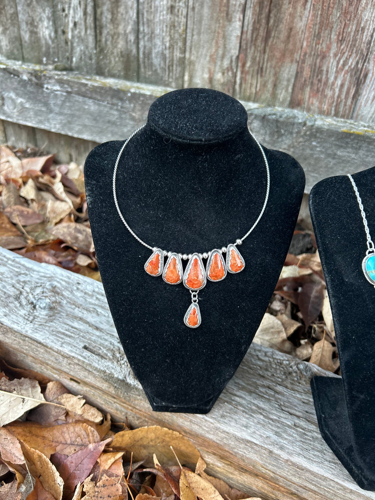 Sterling silver rope choker style necklace with spiny oyster teardrop and silver beads