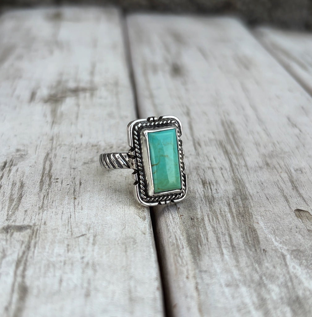 Sterling silver double border ring with Kingman turquoise rectangle stone.