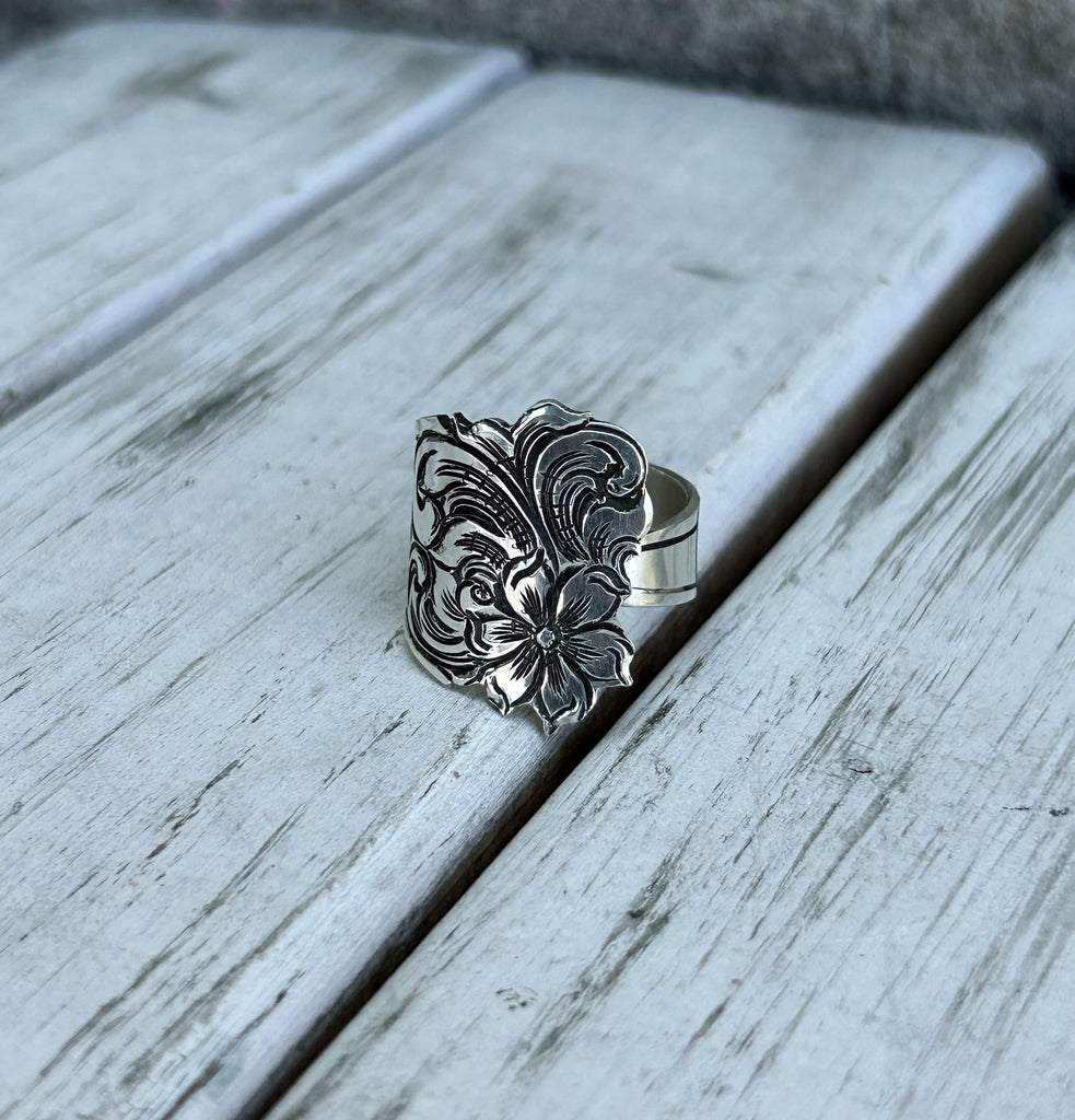 Sterling silver engraved ring. Adjustable, fits 6-8 best