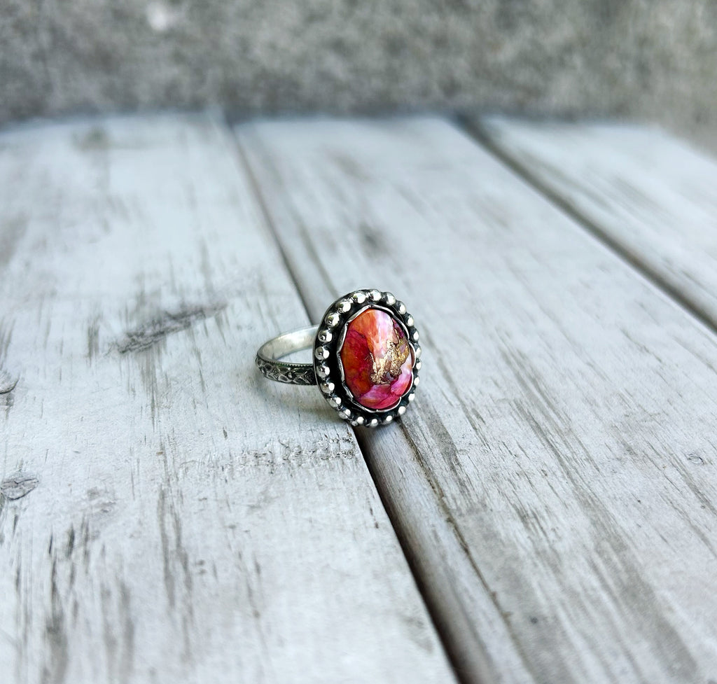 Sterling silver slim band ring with pink spiny oyster stone set in a silver dot border.