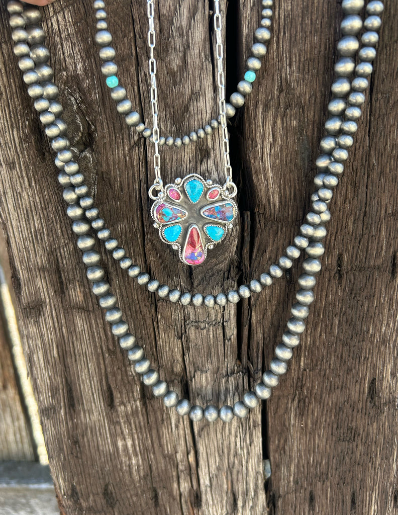 Spiny oyster and turquoise cluster pendant. Set in sterling silver with a sterling silve 18” chain
