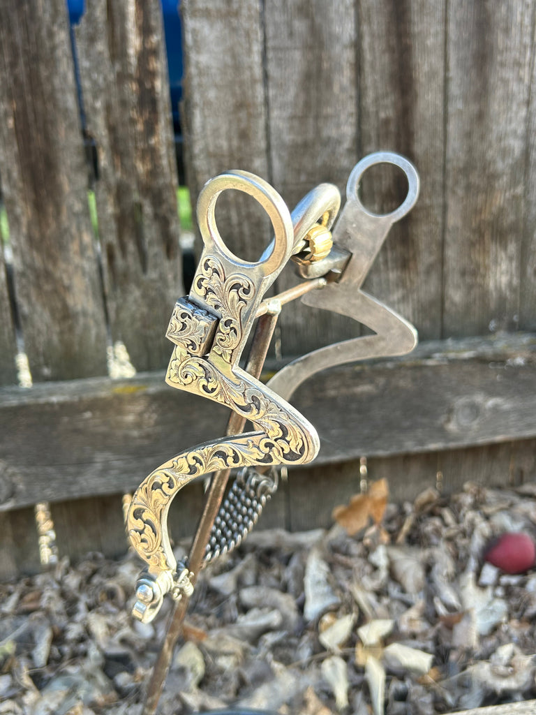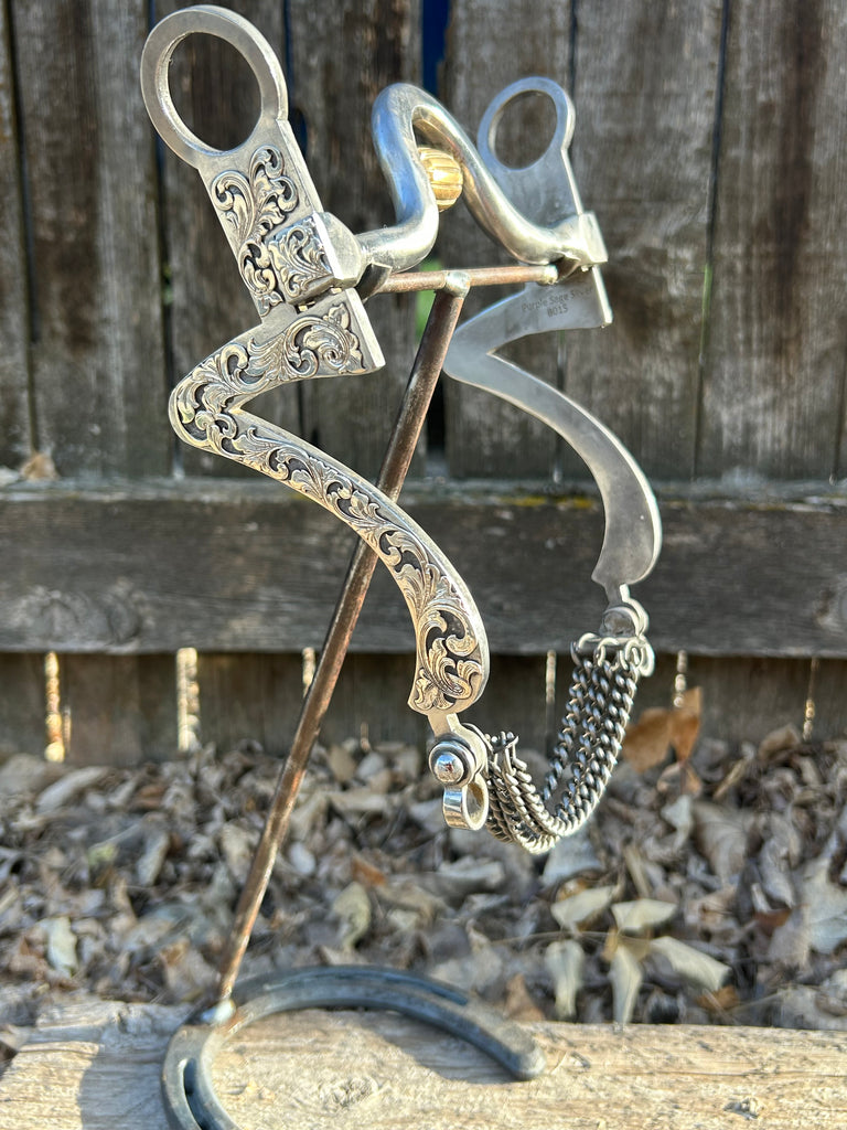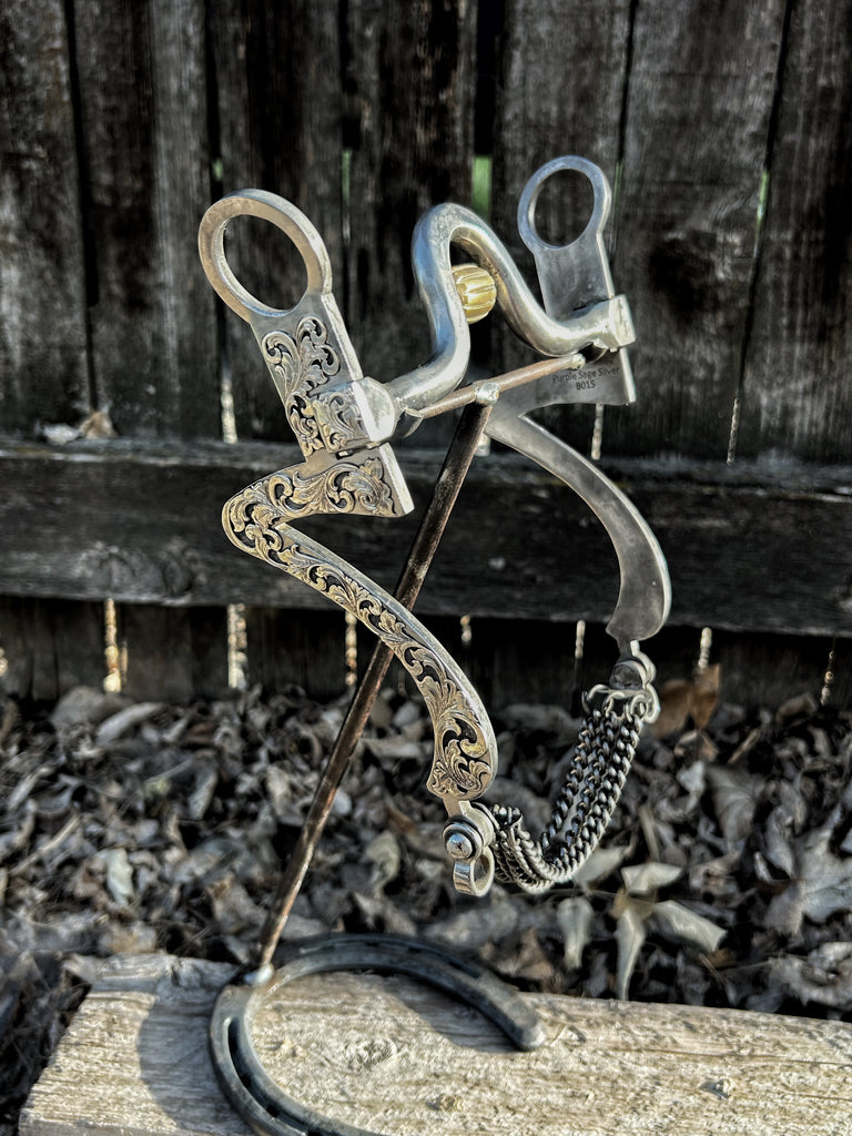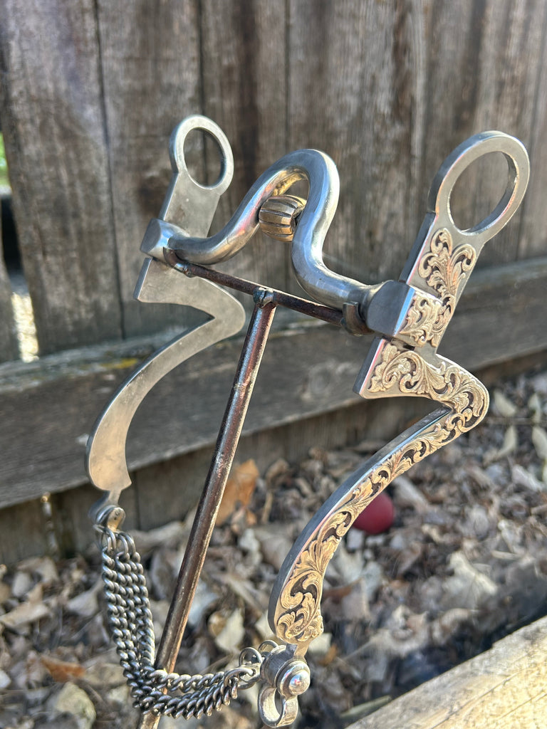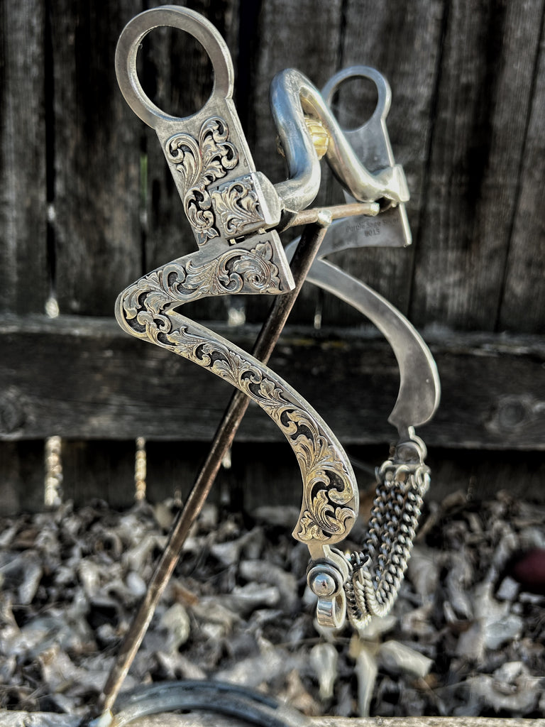 7 shank bit. Sterling silver engraved scroll design overlay with a 5.25” mouth piece, low port,  brass cricket, slobber chains and steel swingers for rein connectors.